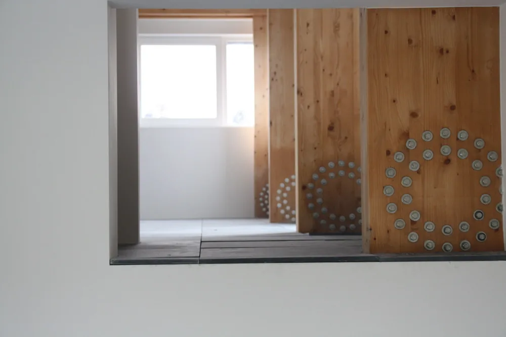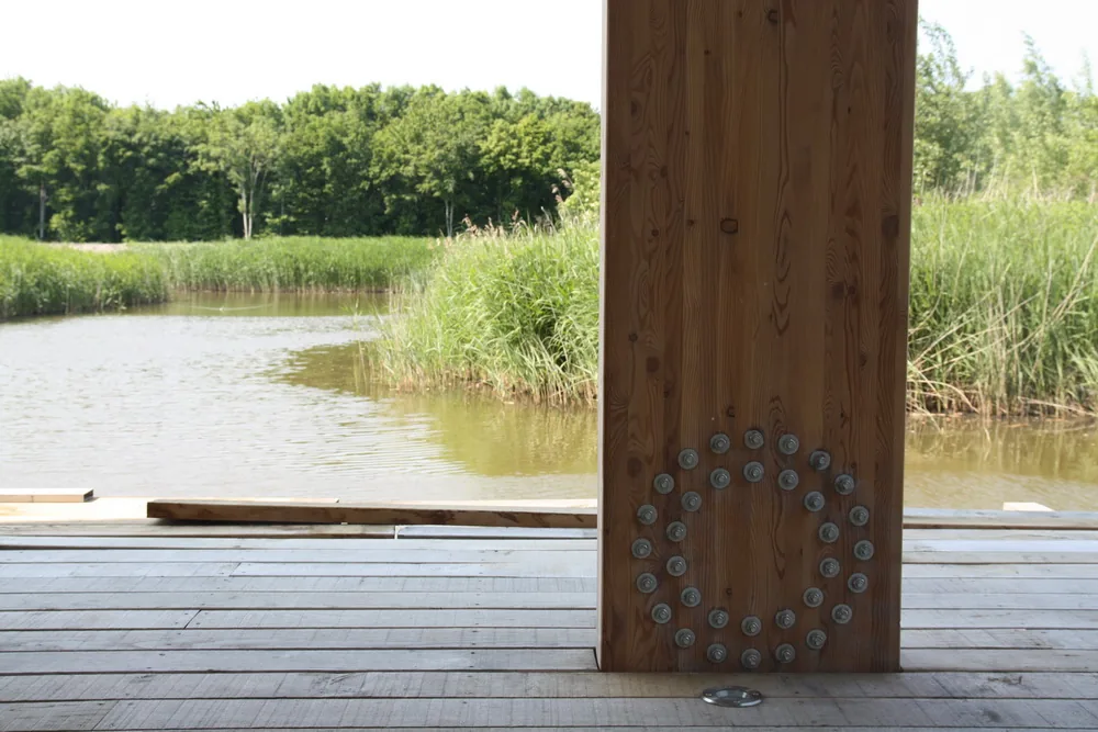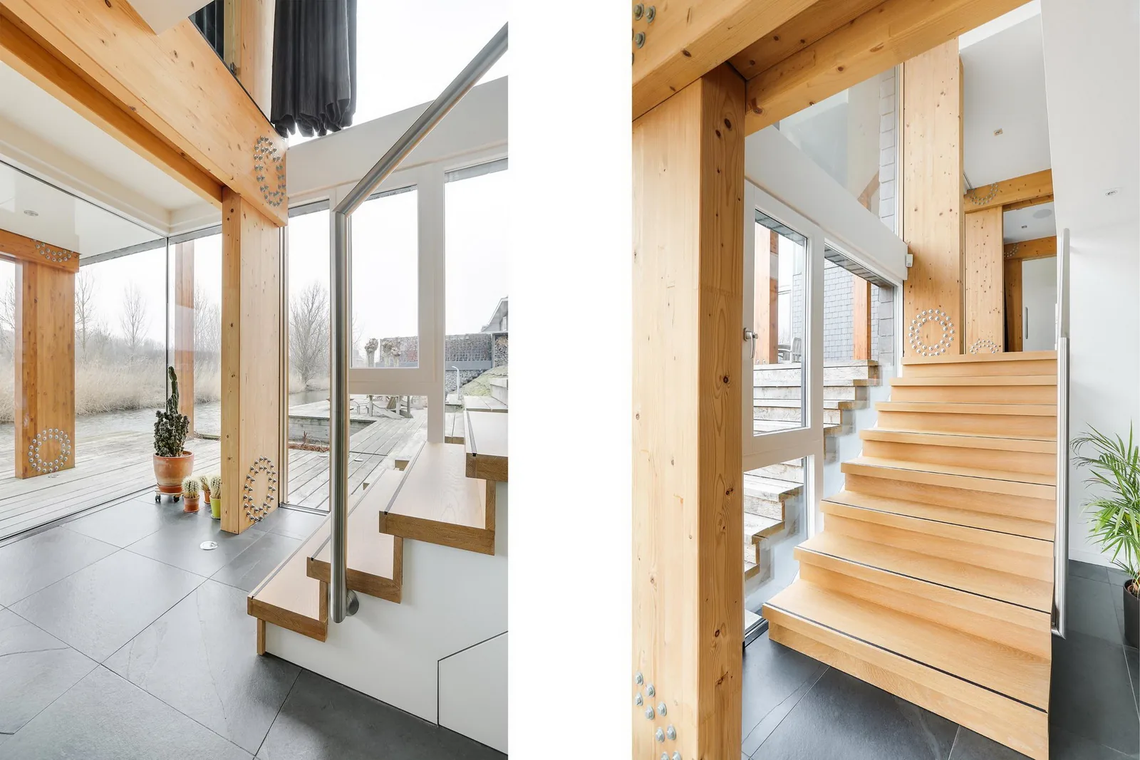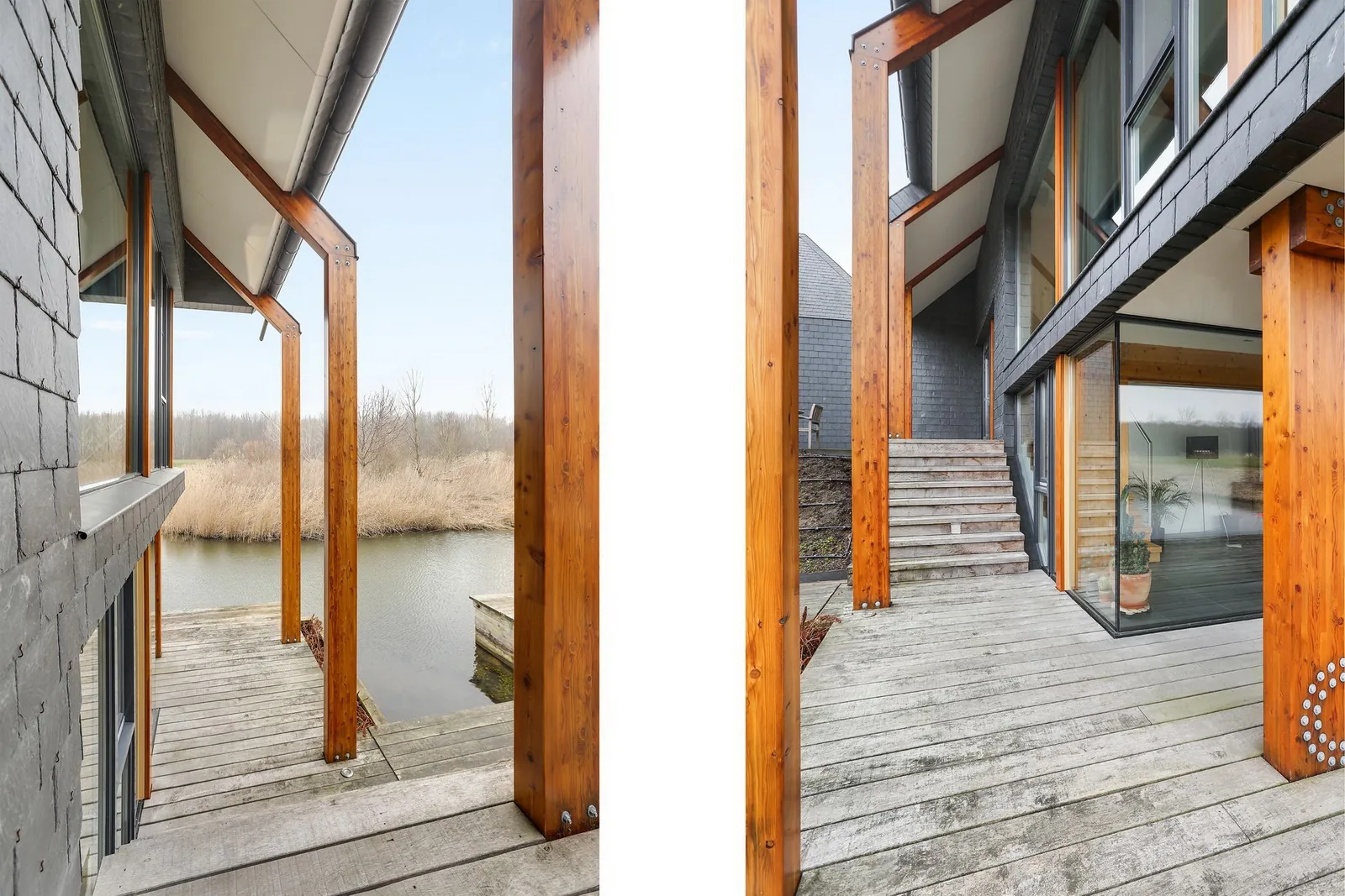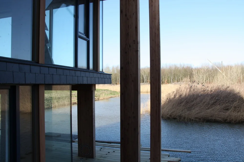 Het hoogteverschil tussen de kavel en het water is benut door het realiseren van twee boven elkaar gelegen woonkamers. De lager gelegen terraskamer grenst direct aan het buitenterras en de vlonder aan het water en vormt een intieme plek dicht bij het landschap. Daarboven ligt een hoger gelegen uitzichtkamer die een weids en vrij zicht biedt richting het verderop gelegen Pampusbos. Deze verticale gelaagdheid maakt het mogelijk om op verschillende momenten van de dag en in verschillende seizoenen andere kwaliteiten van de plek te ervaren.