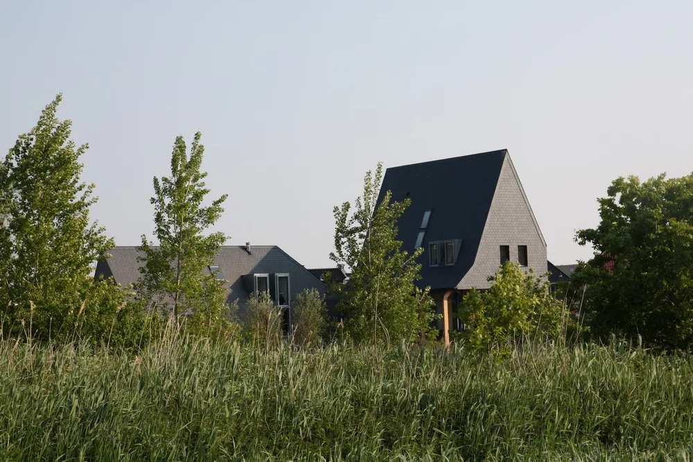 Om het hoge appartementengebouw aan het plein zoveel mogelijk uit het zicht te houden, is aan deze zijde gekozen voor een hogere nokhoogte. Deze ingreep heeft meerdere effecten: niet alleen wordt het zicht vanuit de tuin gefilterd, ook ontstaat er een aangename luwte tegen de vaak aanwezige westenwind die vrij spel heeft over het plein. De woning vormt zo een beschut microklimaat in de tuin, terwijl de hoogte tegelijk bijdraagt aan de ruimtelijke gelaagdheid van het ontwerp. Het is een voorbeeld van hoe architectuur comfort, landschap en stedelijke context kan verbinden.