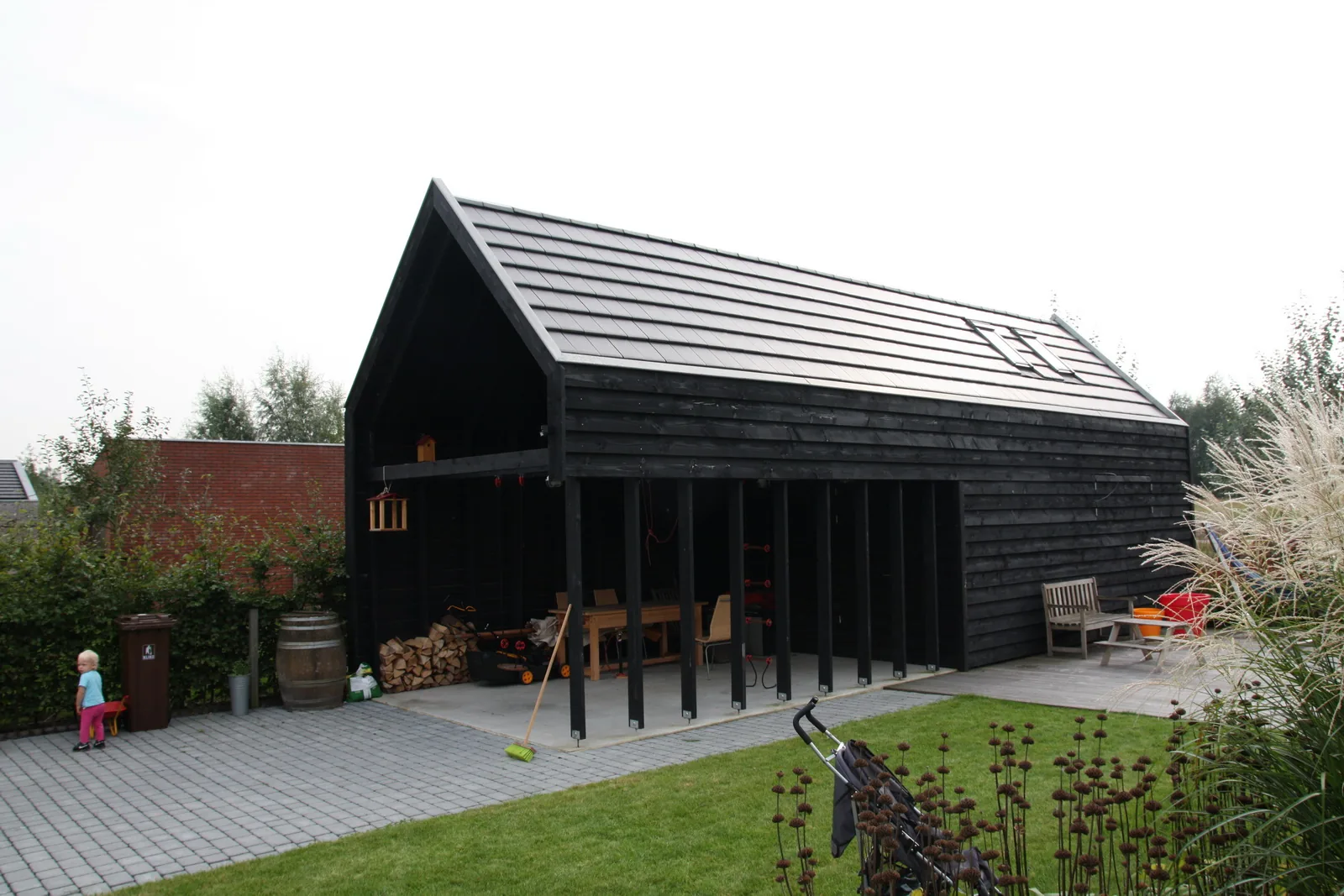 Garage in tuin met zwart geteerd hout als verwijzing naar oude schuren