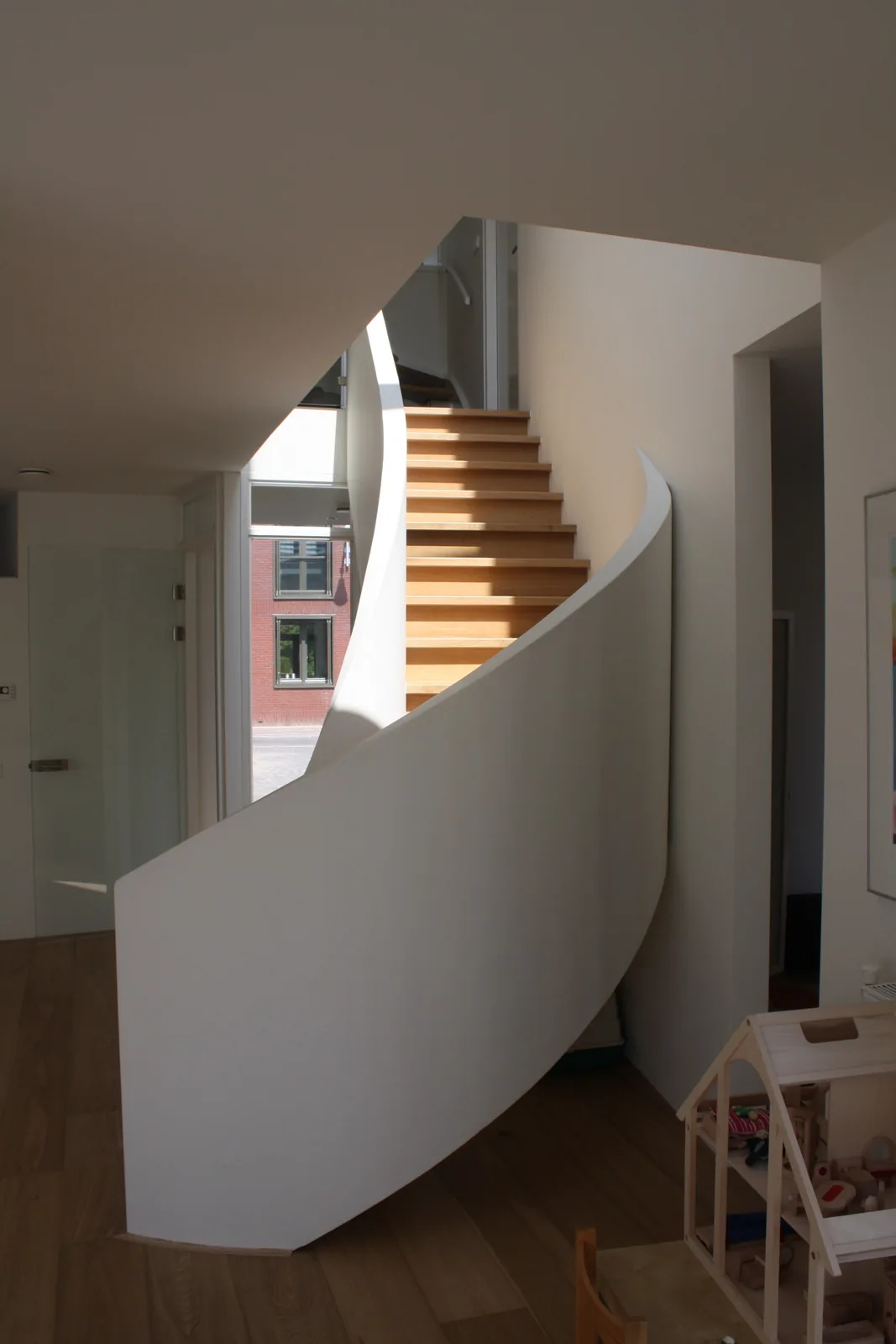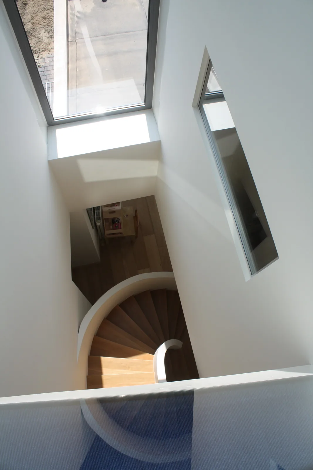 Door strategisch geplaatste gevelopeningen is de woning rijk voorzien van daglicht, terwijl privacy behouden blijft ten opzichte van de openbare ruimte. De openingen zijn niet willekeurig geplaatst, maar zorgvuldig afgestemd op zichtlijnen, functies en oriéntatie. Op de juiste plekken ontstaat uitzicht op het Cronenburgherplein, de omliggende straten en de diepe tuin. Deze balans tussen openheid en beschutting is essentieel voor comfortabel wonen op een zichtlocatie en laat zien hoe complexe stedelijke situaties kunnen worden opgelost.