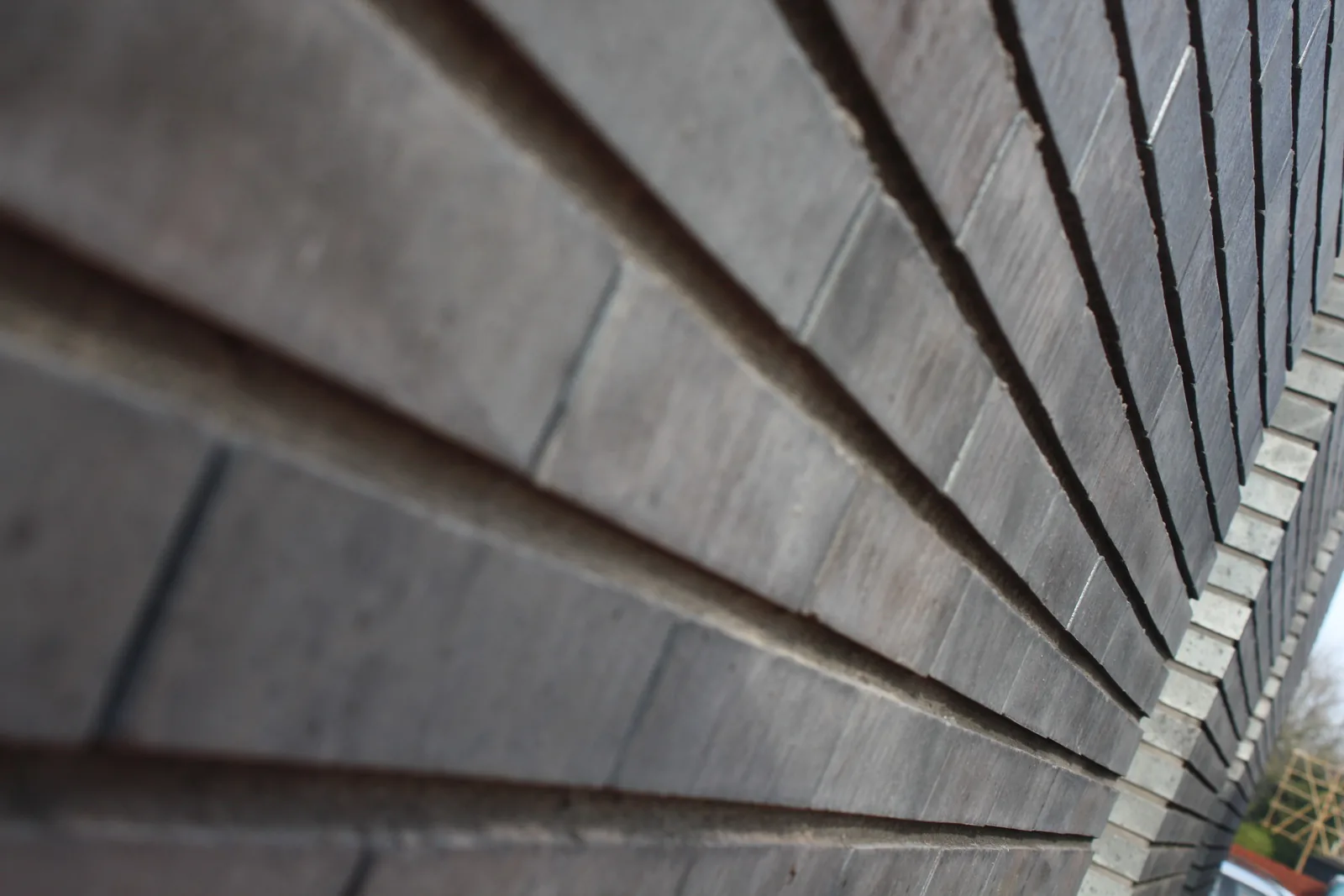 Abstracte gevel knikhuis met strak geplaatste kozijnen en verdraaide kap