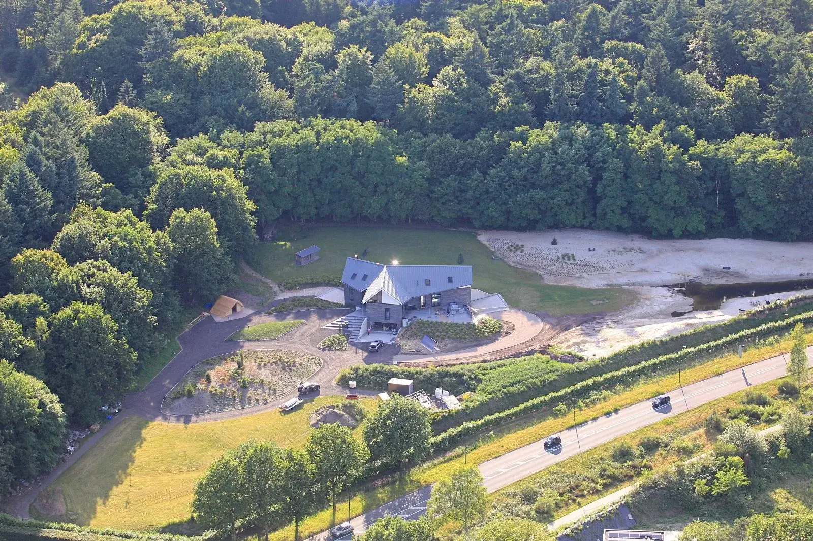 De drie vleugels van de woning verdelen het buitengebied in evenzovele zones. Aan de voorzijde ontstaat een formele entreezone met een slingerende toegangsweg die de aankomst vertraagt en de overgang naar het landgoed voelbaar maakt. Aan de zijde van de rondweg is een landschappelijke zone ingericht die fungeert als buffer tegen geluid en verkeer. Aan de rustige zijde van de kavel ligt de besloten privé-tuin, perfect georiénteerd op de zon en met vrij uitzicht op de aangrenzende bosrand. Samen vormen deze zones een zorgvuldig georkestreerd landschap waarin de woning is ingebed.