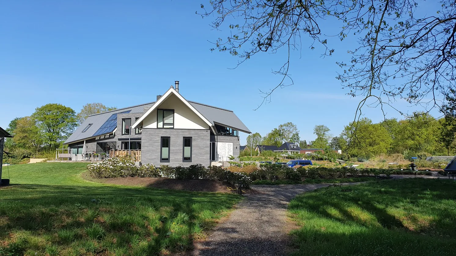 Langgerekte villa op een unieke driehoekige kavel naast landgoed Prattenburg, ontworpen als landschappelijk ensemble met 'wauw'-effect