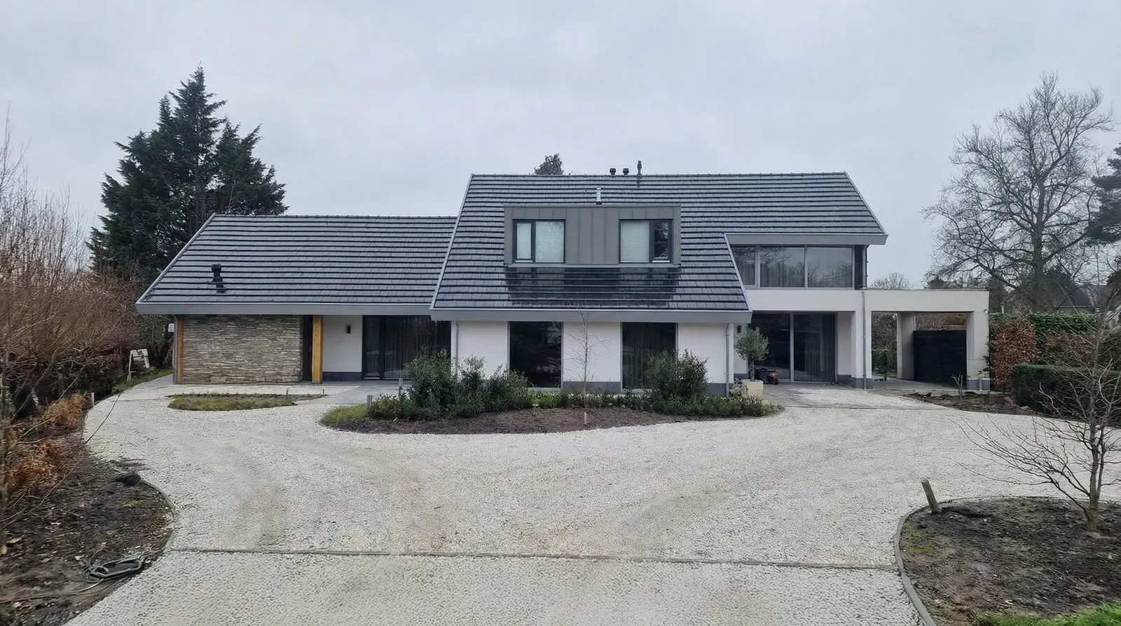 Nieuwe carport als verlengde van het volume bij de entree - wit pleisterwerk en rustige massaopbouw