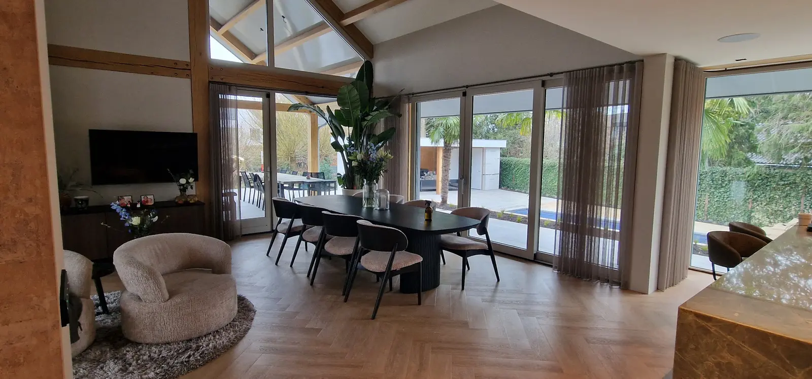Eetzone onder de hoge kap met eikenhouten spanten en zicht op de tuinzijde
