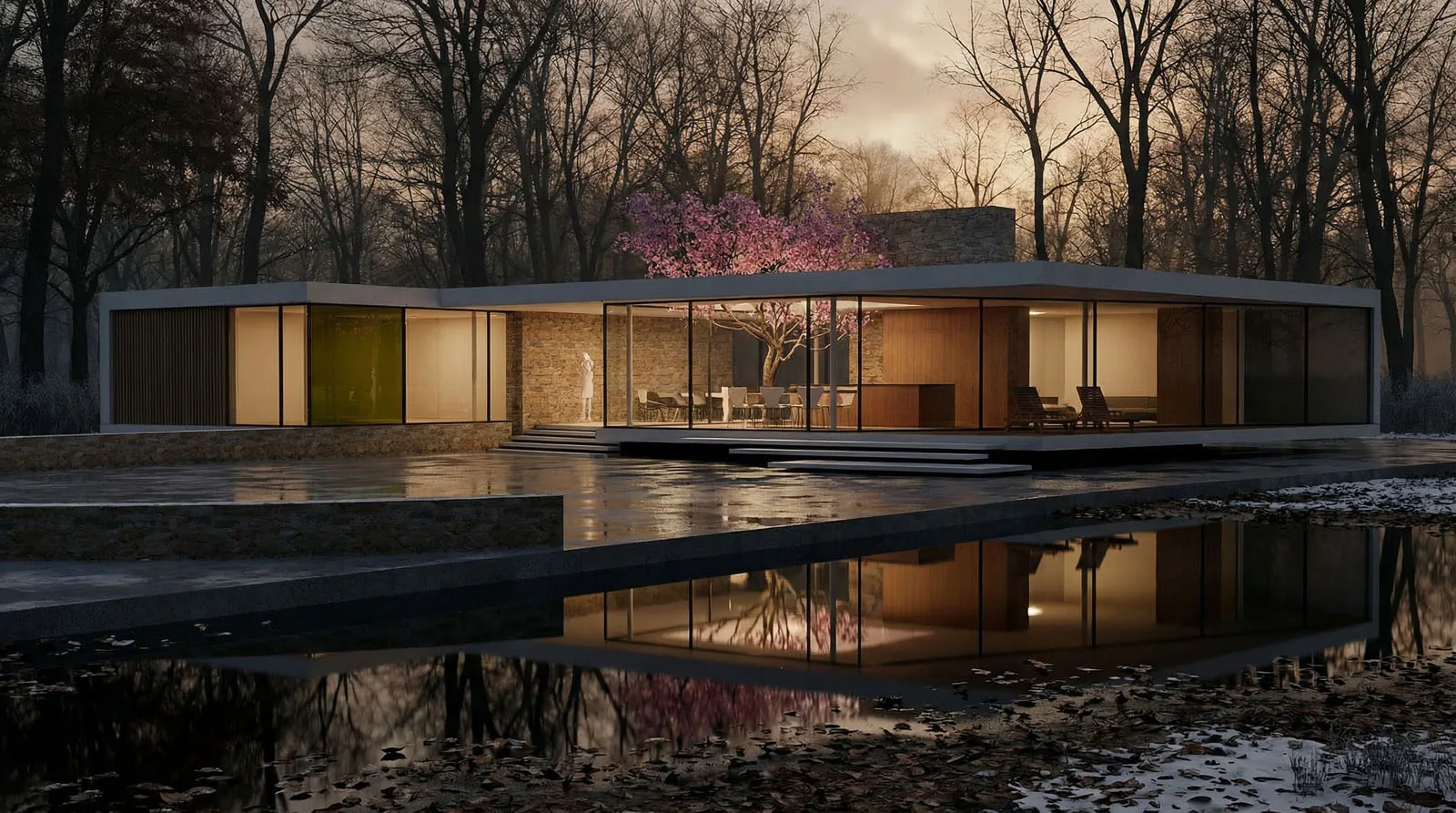 Het ontwerp draait om minimalistische materialisatie met voelbaar contrast. De strakke, witte betoncontouren vormen een krachtig frame voor de volledig glazen gevels. Centrale elementen zoals de schoorsteen en kernwanden zijn bekleed met robuuste natuursteen - tactiel, zwaar en tijdloos. Warme houten accenten (overdekte terrassen en verticale lamellen) voorkomen een klinische uitstraling en verbinden het paviljoen met het landschap. Diepe dakoverstekken geven niet alleen schaduw en comfort, maar versterken ook de horizontale, zwevende uitstraling van het volume.