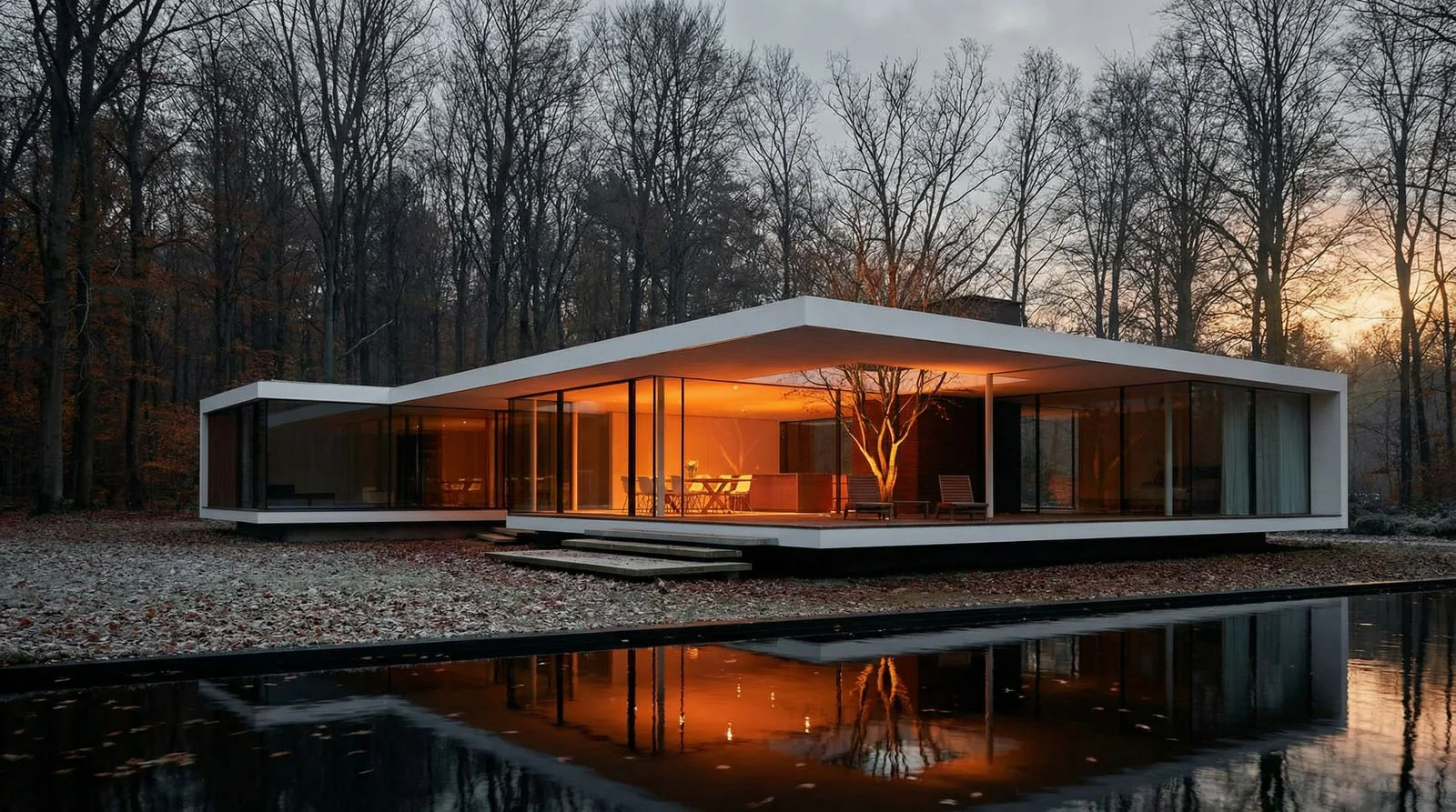 Dit moderne paviljoen aan het water laat zien hoe technische randvoorwaarden (hoogwaterbescherming, oeverintegratie en kelderbouw) juist kunnen leiden tot krachtigere architectuur. Door de woning strategisch te verhogen en de leefruimtes consequent op het water te richten, ontstaat een exclusieve woonervaring met rust, privacy en onbelemmerd uitzicht. Een ontwerp waarin minimalisme niet kil wordt, maar juist warm en rijk - door materiaalcontrast, schaduwwerking en een sterke relatie met de plek.
