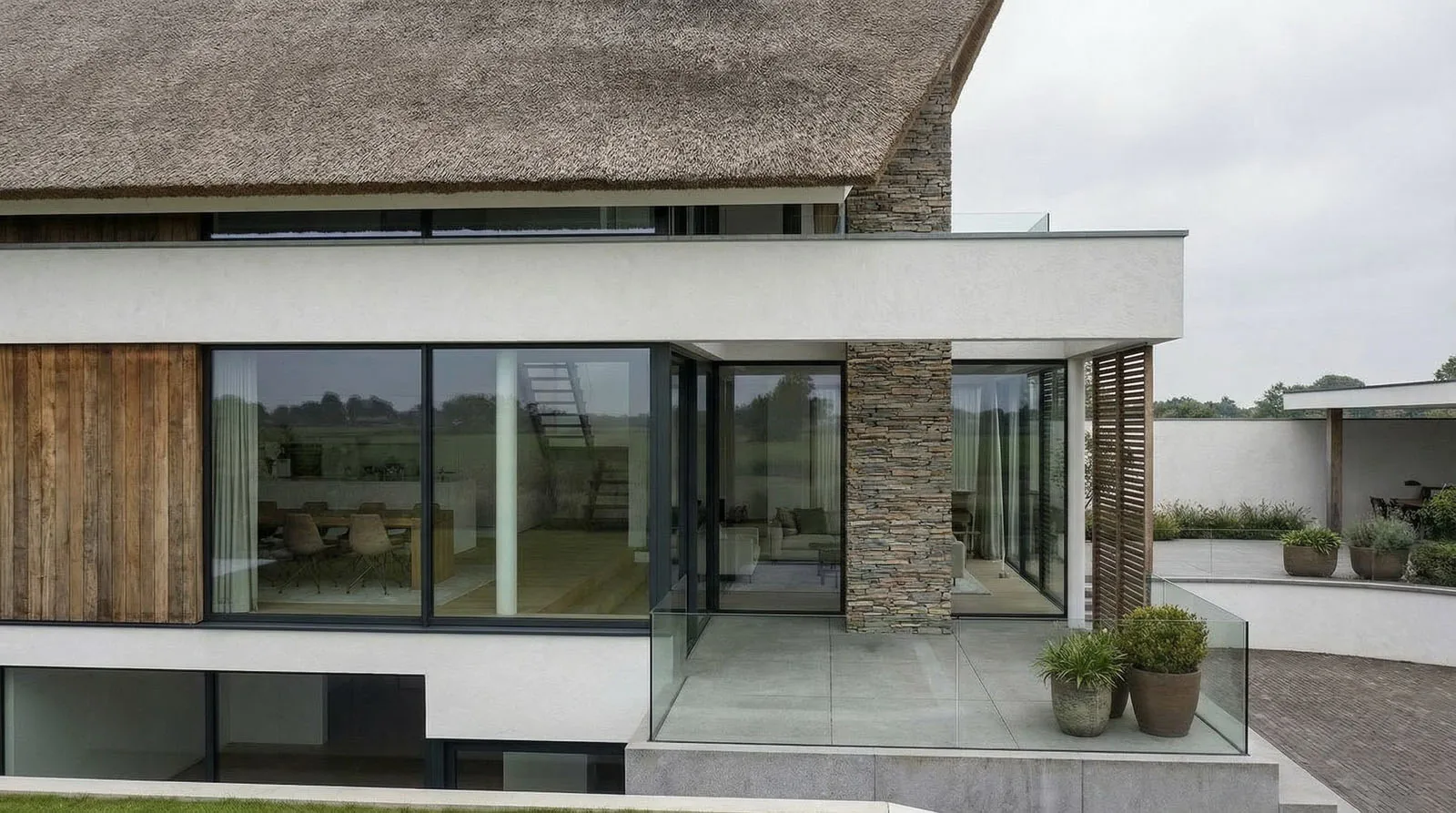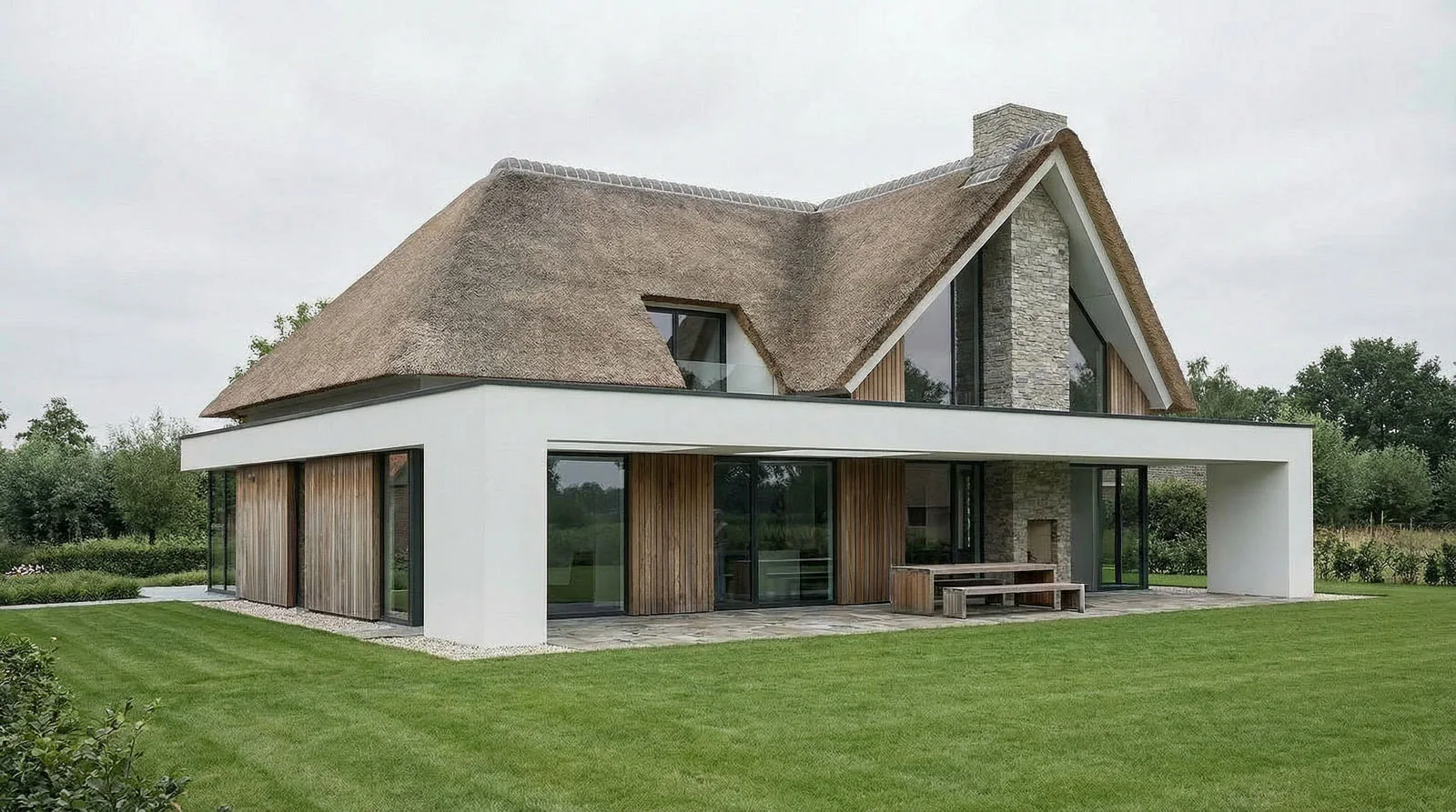 Een luxe rietkapvilla in Het Gooi vraagt om meer dan 'mooie lijnen': het vraagt om begrip van de lokale esthetiek én een moderne visie op comfort en waarde. In dit ontwerp hebben we de traditionele warmte van de rietkap vertaald naar een zero-compromise compositie: strak, licht en strategisch. De kap lijkt te zweven boven een wit gestucte onderbouw, waardoor een krachtig contrast ontstaat. Het resultaat is een sculptuur van rust en precisie - ontworpen om de tand des tijds te doorstaan en een herkenbare signatuur in de regio achter te laten.