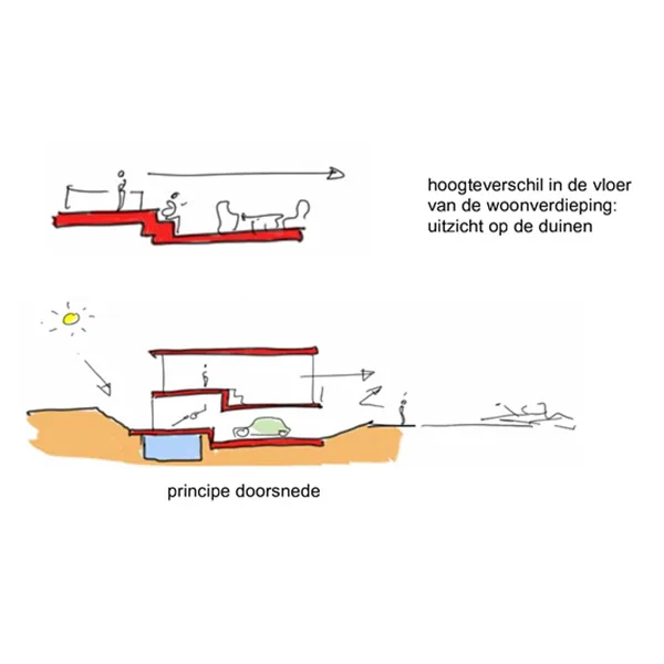 De 'ware' luxe zit vaak in wat je niet direct ziet. Door de villa strategisch te verhogen, ontstond ruimte voor een volwaardig souterrain - een beproefde methode in het hogere segment om extra programma toe te voegen zonder de compositie te verzwaren. De toegang tot de keldergarage is discreet opgenomen in het landschap met natuurstenen keerwanden. Auto's verdwijnen uit het zicht en de tuin blijft maximaal bruikbaar. Het souterrain biedt daarnaast flexibiliteit: denk aan fitness, wijnkelder, atelier of thuiskantoor. In de opzet is bovendien rekening gehouden met een heldere scheiding in routes, zodat een afzonderlijke entree / aanleunoptie inpasbaar blijft.