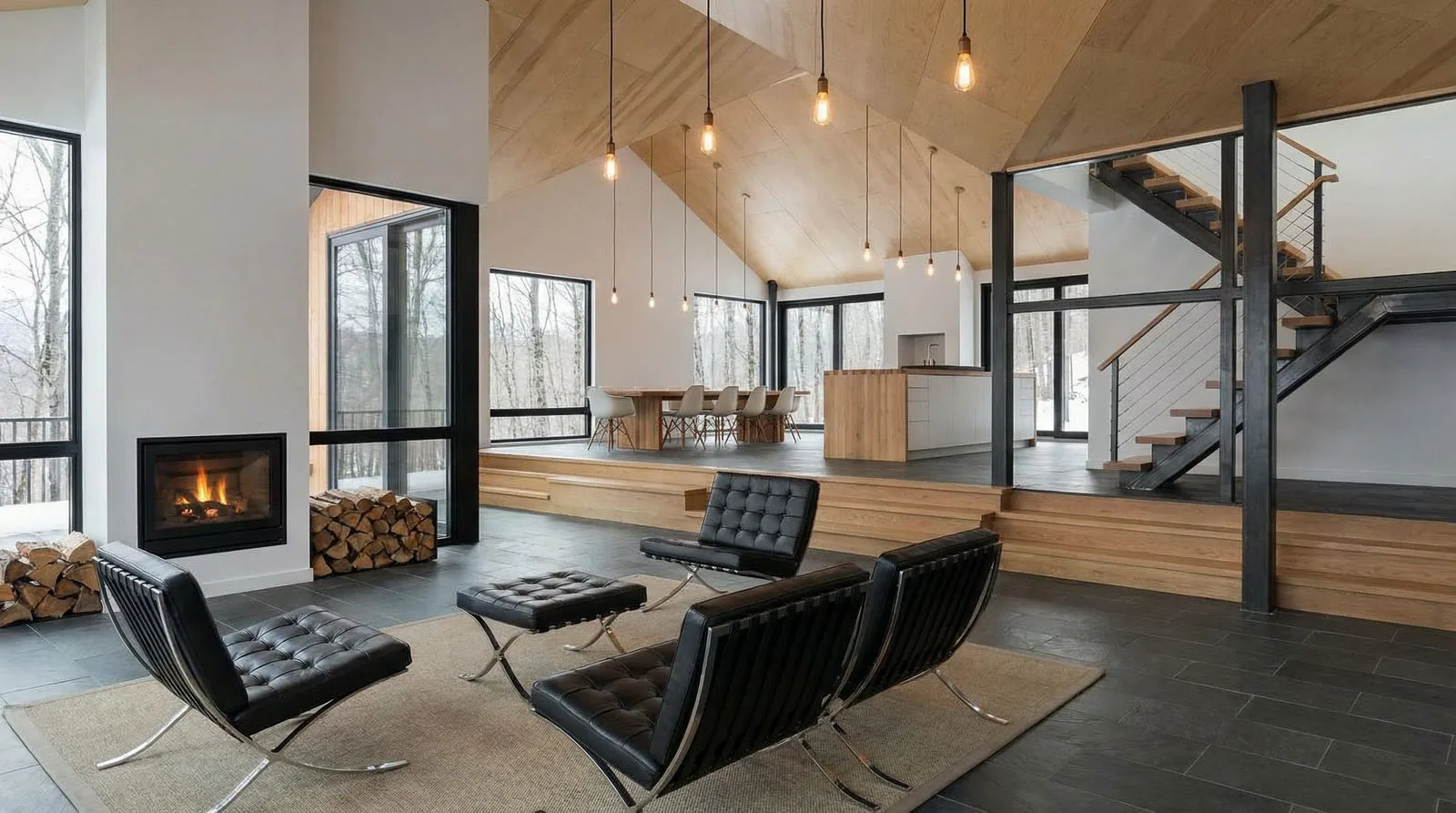 Binnen is de filosofie van integratie doorgezet: maximale glastransparantie zorgt dat het interieur de hele dag in natuurlijk licht baadt, met de tuin als continu decor. De focus ligt op open, vloeiende ruimtes en ruimtelijkheid in twee richtingen: horizontaal door lange zichtlijnen, en verticaal door de vide en plafondhoogtes. Design details: materialen uit de gevel (warm hout, strak stucwerk en natuursteen) keren terug in maatwerk interieurelementen. Een robuuste natuurstenen haard fungeert als sculpturaal ankerpunt in de leefruimte. Alles is ontworpen als één geheel - van lichtplan tot materialisatie.