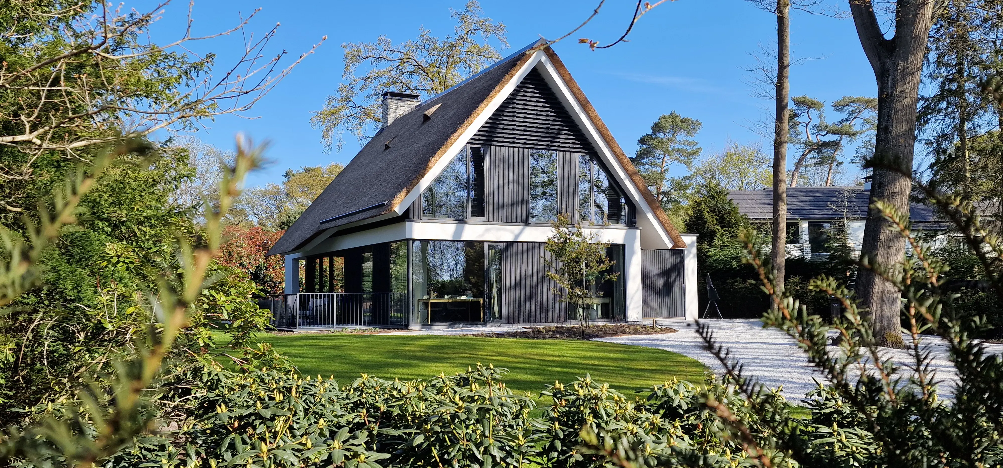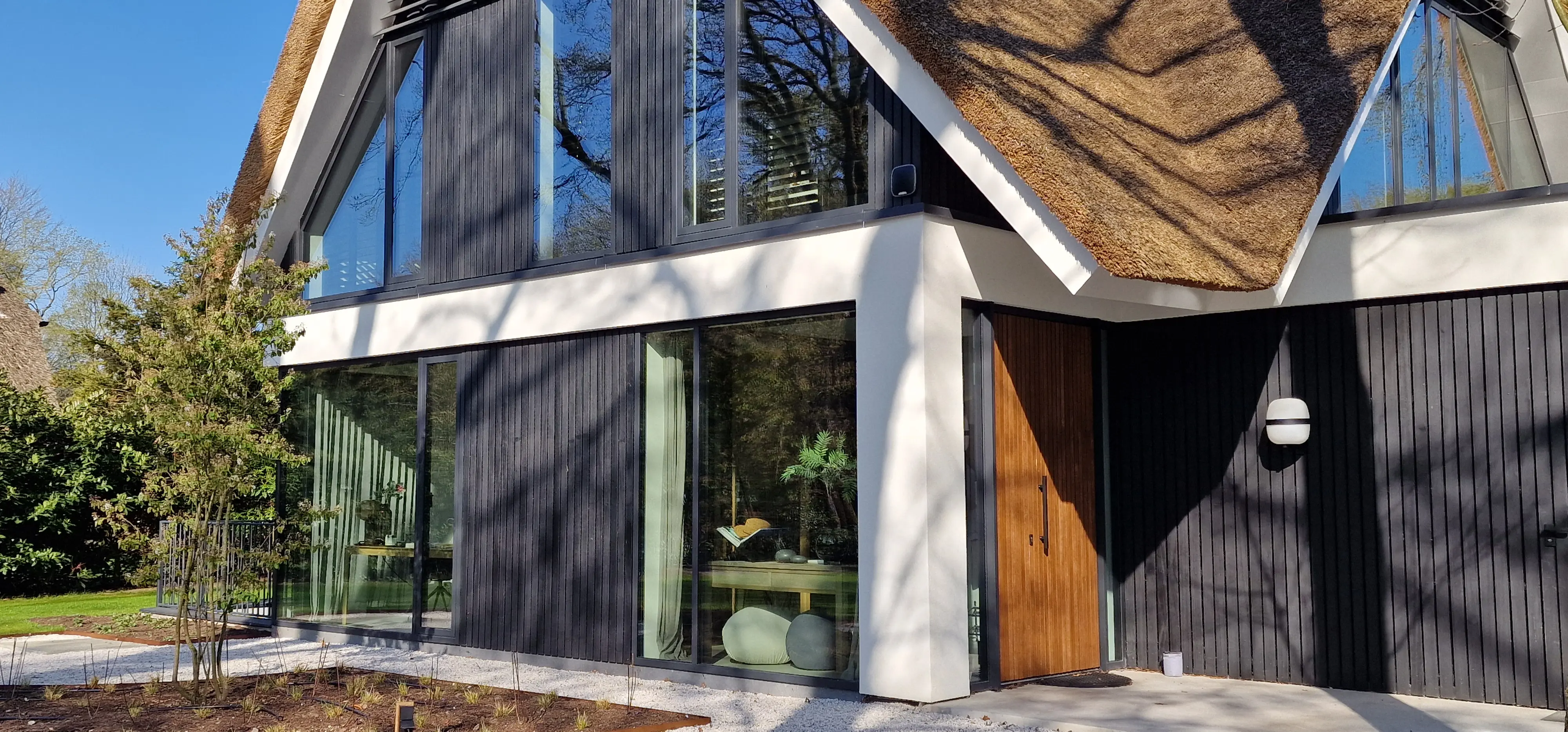 De villa springt direct in het oog door de contrasterende combinatie van een moderne, witte pleistergevel en een ambachtelijk rieten dak. Zwart gebeitst hout en aluminium lamellen geven extra diepte aan de gevels en versterken het spel tussen licht en schaduw. Strakke lijnen en een heldere vormentaal maken deze woning tot een subtiel maar uitgesproken verschijning in de bosrijke omgeving van Blaricum een plek waar luxe wonen en architectonische kwaliteit samenkomen.
