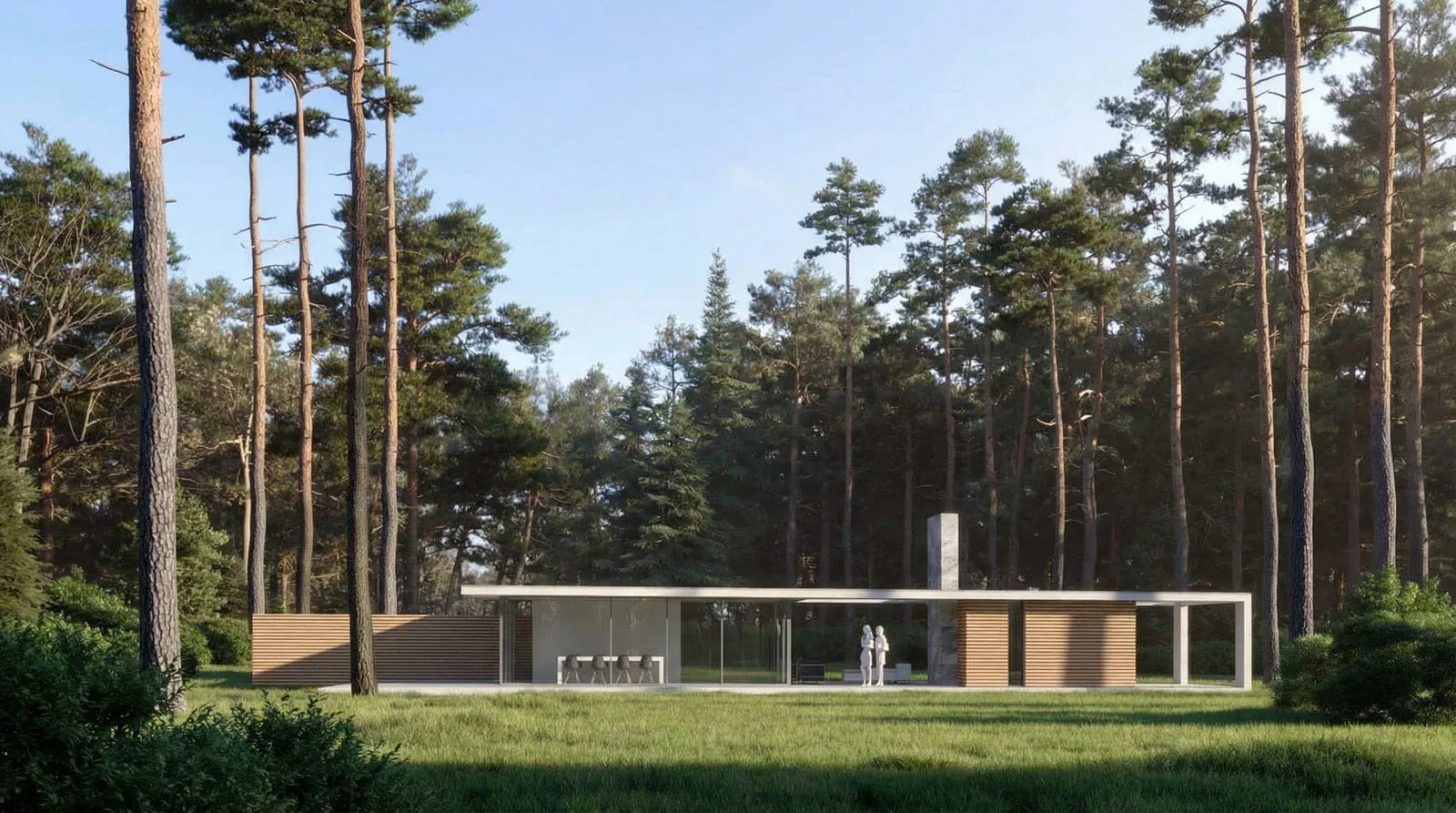 De plattegrond is ontworpen rondom open leven en een constante visuele verbinding met het bos. Interne wanden zijn geminimaliseerd om licht en zicht te laten doorstromen. - **Flexibele ruimtes**: houten panelen kunnen zones afsluiten wanneer nodig, zonder de architectonische flow te breken. - **Centrale haard**: een stenen/betonnen haard fungeert als sculpturaal ankerpunt in de open leefruimte. - **Buitenleven**: een vlak houten terras verlengt de living de tuin in - gemaakt voor rust, stilte en seizoensbeleving. De routing en zonering zijn bovendien zo gedacht dat een separate entree / aanleunfunctie inpasbaar blijft, zonder dat het hoofdconcept verandert.