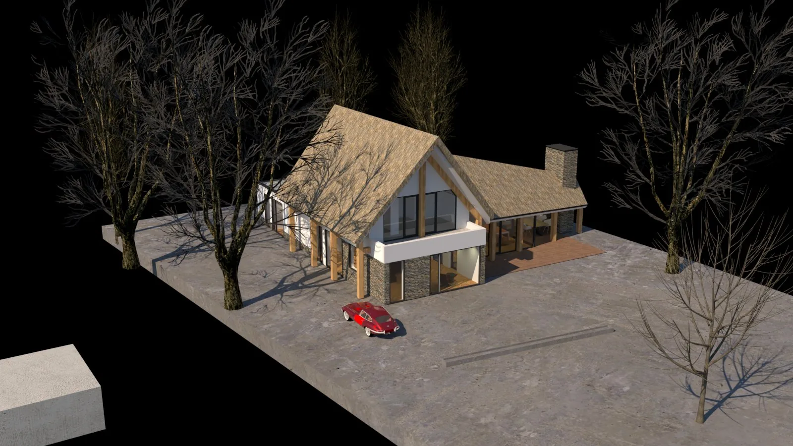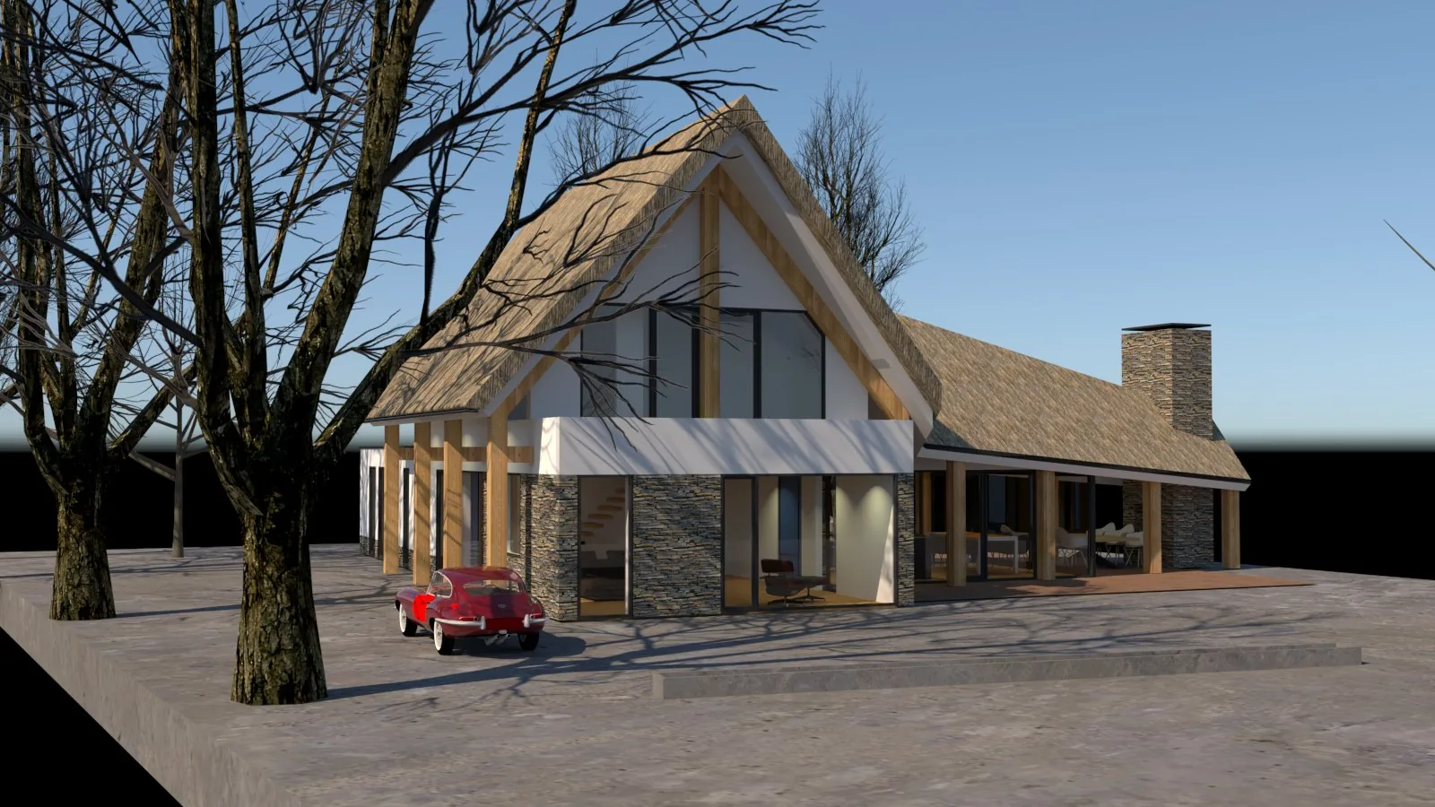 De materialisatie bestaat uit een klassieke combinatie van eikenhouten spanten, pleisterwerk, natuursteen en een sculpturale rieten kap. Deze elementen verwijzen subtiel naar traditioneel vormgegeven woningen uit de regio, maar zijn in een eigentijdse compositie toegepast. Het resultaat is een karakteristieke villa die vanzelfsprekend opgaat in haar omgeving en tegelijkertijd een eigen, herkenbare identiteit heeft.