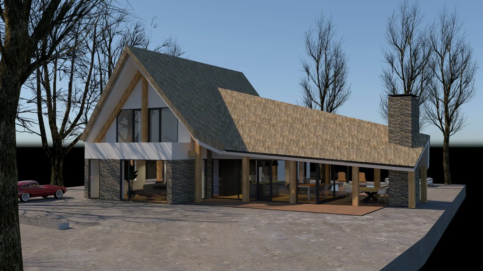 Door slim gebruik te maken van de afwijkingsbevoegdheden die het bestemmingsplan biedt, is extra woonoppervlak toegevoegd. Daarnaast is de kap bewust ingezet als ruimtelijk instrument. Door de overstekken van het rieten dak te vergroten, ontstaat extra hoogte en daarmee meer bruikbare ruimte op de verdieping. Ook is maximaal gebruik gemaakt van de mogelijkheden die vergunningsvrij bouwen biedt. Samen zorgen deze ingrepen ervoor dat een comfortabele woning mogelijk werd, ondanks het beperkte bouwvlak.
