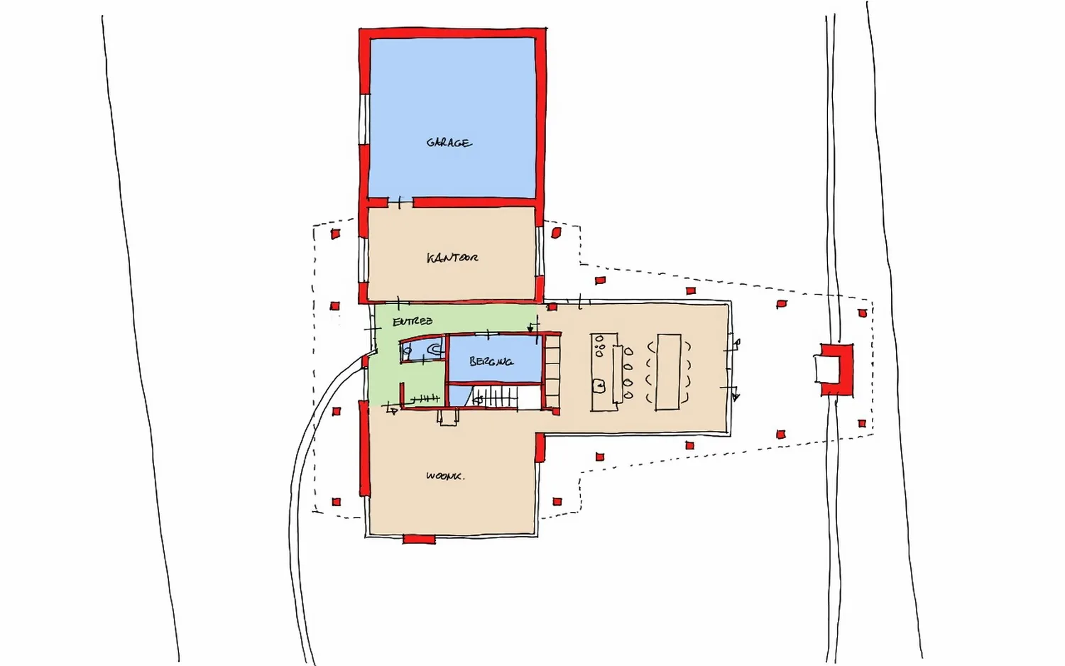 Het perceel in Kortenhoef biedt prachtige zichtlijnen richting het aangrenzende natuurgebied, maar kent ook duidelijke beperkingen. Voor de woning ligt een drukke weg en het bestemmingsplan schrijft een niet logisch gepositioneerd bouwvlak voor. Bovendien liet het bestemmingsplan slechts een bouwvlak toe van circa 54 m. Op papier een forse beperking, maar tegelijkertijd een interessante ontwerpopgave: hoe realiseer je op deze plek toch een volwaardige en comfortabele woning