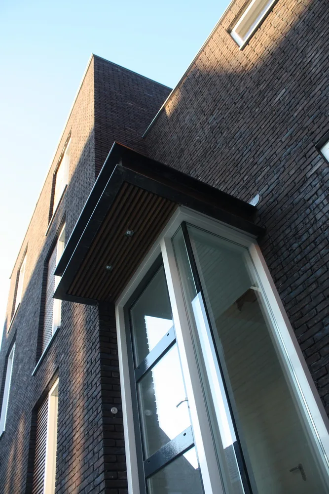 Stadswoning in Coendersbuurt Nieuw Delft met contrast tussen metselwerk, glas, zink en houten schermen