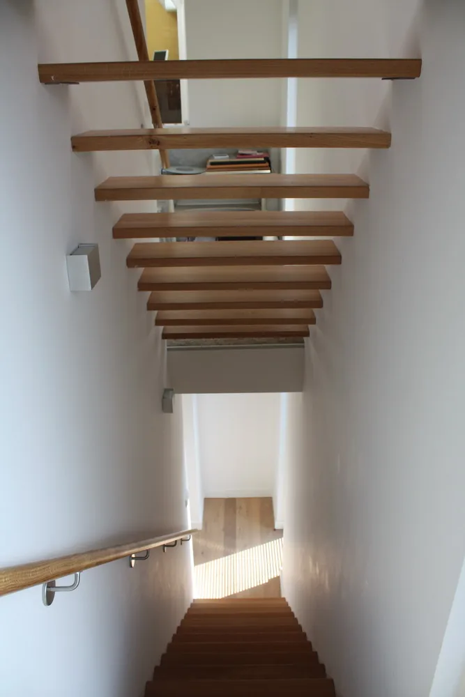 De verdraaide voorgevel maakt ruimte voor de entree van de woning. Deze entree vormt de scheiding tussen een aantal vloeren op verschillende niveaus. In de woning ontstaat daardoor ruimte voor een verdiepte berging en een verhoogde zithoek in de woonkamer. Deze vloersprongen zorgen voor een subtiel ruimtelijk spel en versterken de beleving van het interieur.