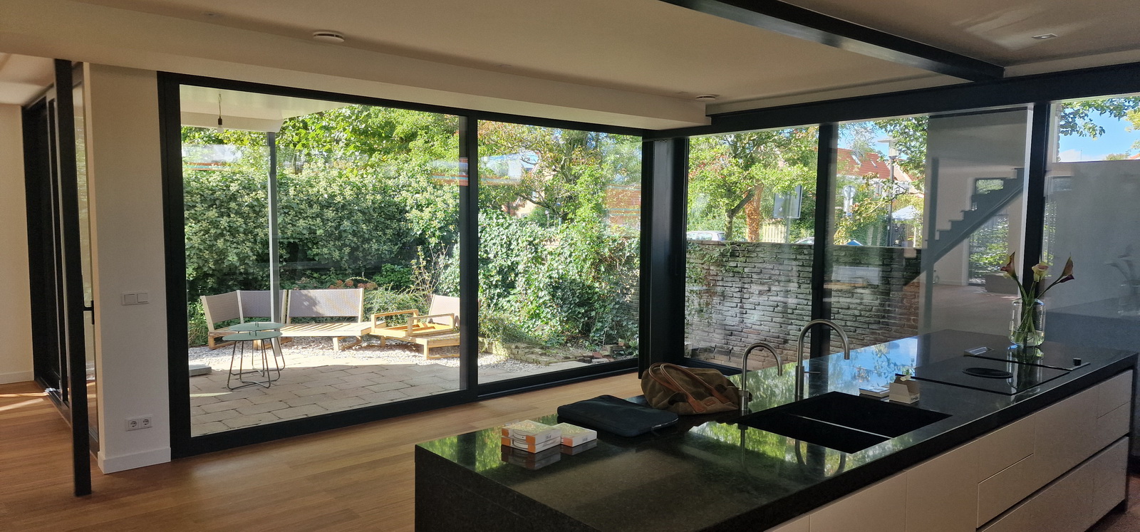 De bestaande garage heeft plaats gemaakt voor een prachtige keuken die de avondzon binnen haalt en de tuin betrekt bij de woning door de grote glazen schuifpuien. Visueel wordt de tuin daardoor onderdeel van de gehele woonbeleving en is er door het handhaven van de tuinmuren privacy maar toch ook zicht op de bomen en ruimte achter de woning. Van vervallen woning tot nieuwe parel in de dorpskern van Loenen aan de Vecht.